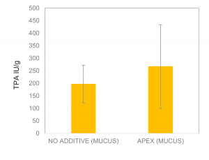 The supplementation with APEX® BRANCHIA increased the biological activity (IU/g) of TPA by 30 percent (Fig. 2), which can be translated into an increased proteolytic potential of the mucus. However, due to the high variability among the measurements, no statistical significance was observed. Therefore, a higher number of replicates would improve the statistics and lead to a more concise result. As far as the inhibitory effect is concerned, APEX® BRANCHIA consistently delayed the growth of both bacterial populations during both exponential and early stationary phases (Fig. 3), corroborating to the previous TPA result. Therefore, the preventive antibacterial properties of the mucus are optimized by the dietary inclusion of APEX® BRANCHIA.