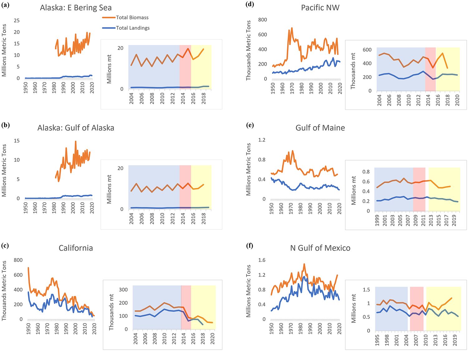 Resilience at the system level may not necessarily transfer to particular species or groups of species with ecological or economic importance, such as Alaskan snow crab or Pacific cod, whose biomass and landings remain at lower levels post-heatwave. Additionally, factors from climate change, species physiology, fishing practices, ecological interactions, among other considerations within a given system, may influence the level of resilience. But this level of systemic or higher aggregate group level stability implies opportunities for fisheries diversification. Conversely, when even higher hierarchical levels or even the total system values of biomass, landings or revenue have significantly shifted, that is a clear signal of major perturbations having occurred that need to be either addressed much more systematically than on a taxa-by-taxa basis or recognized as a shift to new conditions.
