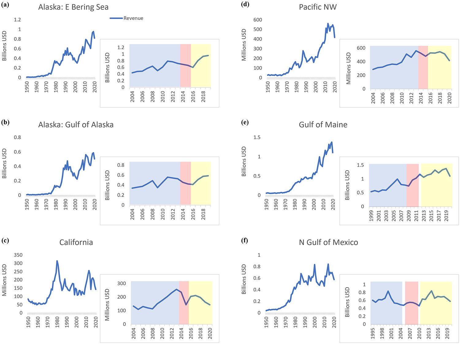 There were clear responses to extreme events and distinct warming periods that were detectable in the marine ecosystems that we examined in terms of differences for biomass, landings, and revenue among time periods. They were observed across multiple facets of these socio-ecological systems. The responses varied, but that we were readily able to detect these responses in association with extreme events is not trivial.
