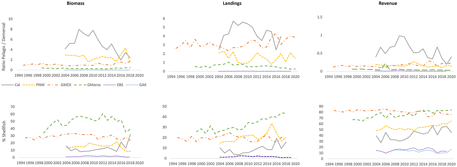 We would predict that ecosystems dominated by small pelagics, more vulnerable shellfish species, or both could be more susceptible to change into alternate steady states. This response would be seen ultimately in total ecosystem biomass, with the entire system going from being relatively stable due to primary production “table-setting” that sets the levels of biomass, landings and revenue in an ecosystem, to a less productive and more easily perturbed ecosystem, as influenced by dynamics in primary and higher-level production associated with these responses.