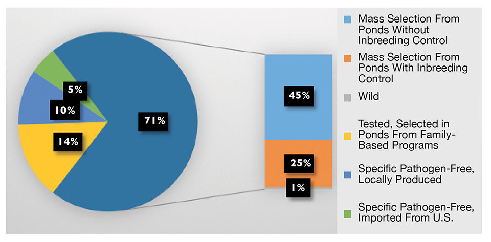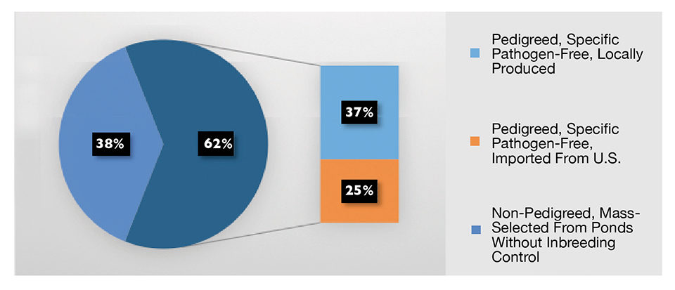 On the other hand, in Asia, the industry follows an SPF broodstock concept, in part because L. vannamei are not endemic to the region. Most of the global breeding programs focus on SPF shrimp for the Asia market. However, we still see many hatcheries using F2 broodstocks selected from culture ponds (Figure 2).