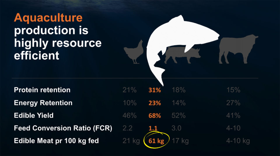 “We have a shortage of resources. Despite all the gloom and doom – and I don’t do gloom and doom – people need to be fed. And if we ask ourselves, ‘How are they going to be fed?’ and ‘What is the best protein to feed them?’ and ‘What is the most efficient protein to feed them?’ and ‘What’s the best use of our resources?’ … we think of protein retention, energy retention and meat per 100 kilos. Poultry, beef: At 21 kilos, it’s not a pretty picture. It’s certainly not a very efficient picture,” said Lyons. “Yet we drop in aquaculture? We get 61 kilos. The most efficient protein converter out there is aquaculture. We are absolutely in the right business.”
