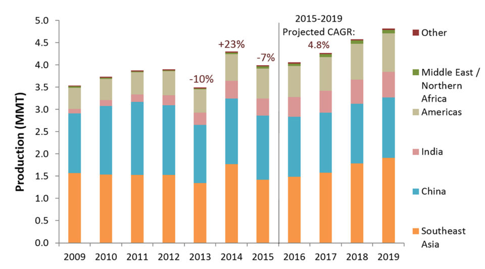La producción de camarones creció constantemente en el este de Asia hasta 2011, con una tasa de crecimiento anual compuesta (CAGR) de 5.0 por ciento de 2008 a 2011. Según datos de GOAL, la producción disminuyó de 3.35 MMT a 3.33 MMT en 2012 (- 0.6 por ciento) y más baja a 2,94 MMT en 2013 (- 11,6 por ciento) debido al impacto de EMS en China, Tailandia y Malasia (Fig. 2). Los desafíos de la enfermedad también han llevado a fluctuar los niveles de producción en Vietnam e Indonesia. La recuperación de las cosechas en China, Vietnam e Indonesia, junto con un fuerte crecimiento en la India, impulsaron nuevamente la producción en el este de Asia en 2014 (+ 24,3 por ciento a 3,66 MMT), solo para ver una disminución de la producción en la mayoría de los principales países en 2015 (- 10,9 por ciento a 3,26 MMT).