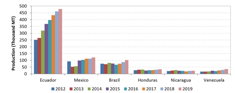 Además de Ecuador y México, Brasil, Venezuela, Honduras y Panamá reportaron expectativas positivas de crecimiento hasta 2019, elevando la producción en la región de 678,000 TM en 2015 a 868,000 TM en 2019 (CAGR de 6,4 por ciento). Algunos otros países, como Nicaragua, Guatemala, Perú y Colombia, esperan un crecimiento escaso o nulo debido a razones que van desde el impacto de las enfermedades hasta un reducido potencial de expansión de las áreas de producción.