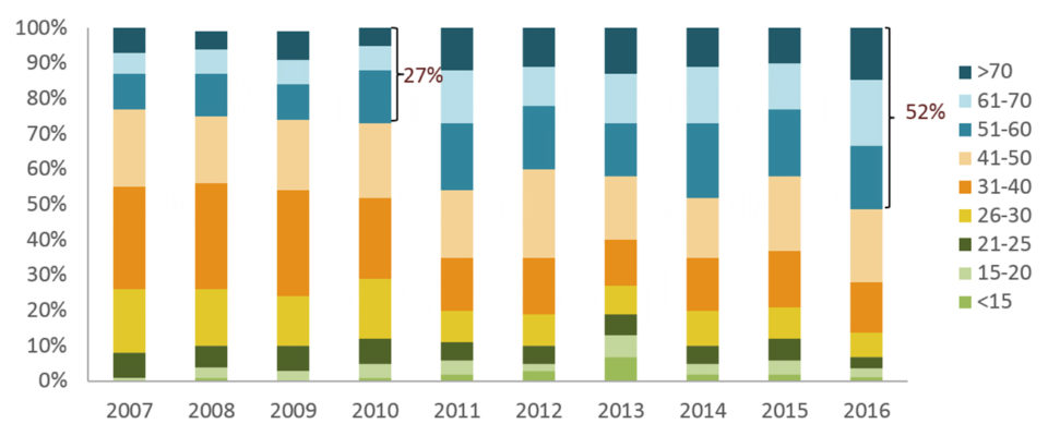Los encuestados en Asia han reportado un movimiento hacia la producción de tamaños más pequeños (51-60 y menores) desde 2011 (Fig. 4). La proporción de pequeños conteos aumentó de 27 por ciento a 52 por ciento entre 2010 y 2016. El cambio a camarones más pequeños parece estar motivado por la reducción de los márgenes de precios entre los tamaños pequeños y las tallas más grandes. Las cosechas tempranas causadas por EMS y otras enfermedades también ayudan a explicar esta tendencia.
