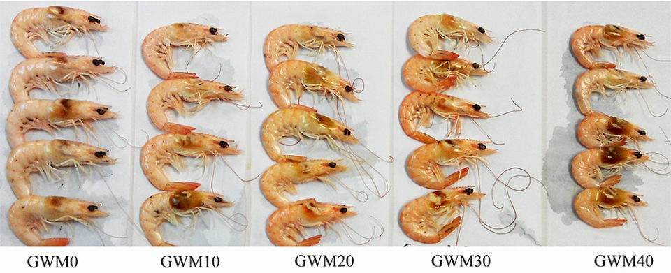 Shrimp fed with GWM-based diets appeared to be redder/more orange when compared to the control diet. This is supported by the significantly higher (p<0.05) carotenoid concentrations in GWM-based diets than in the control diet (GWM0), as shown in Fig. 3.