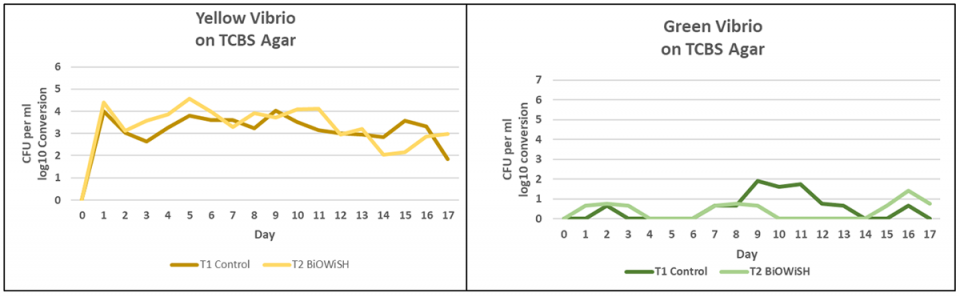 Fig. 3 shows yellow and green Vibrio counts for both treatments. Yellow Vibrio counts are similar. In general, yellow Vibrio are not pathogenic. Green Vibrio counts are greater in T1 than T2. Many green vibrios can be pathogenic.