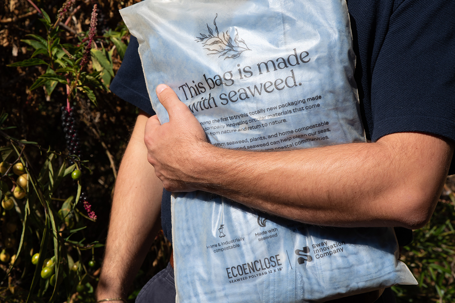The removal of plastic from the supply chain is the premise for Sway, a San Francisco Bay Area company that transforms farmed seaweed and plants into a resin that mimics the look and feel of plastic. The resin is designed to fit the same machinery that creates traditional plastics, but unlike traditional plastics, Sway’s TPSea™ (Thermoplastic Seaweed) decomposes within 90 days in industrial facilities and within 180 days in home composting facilities, TUV Austria standards.