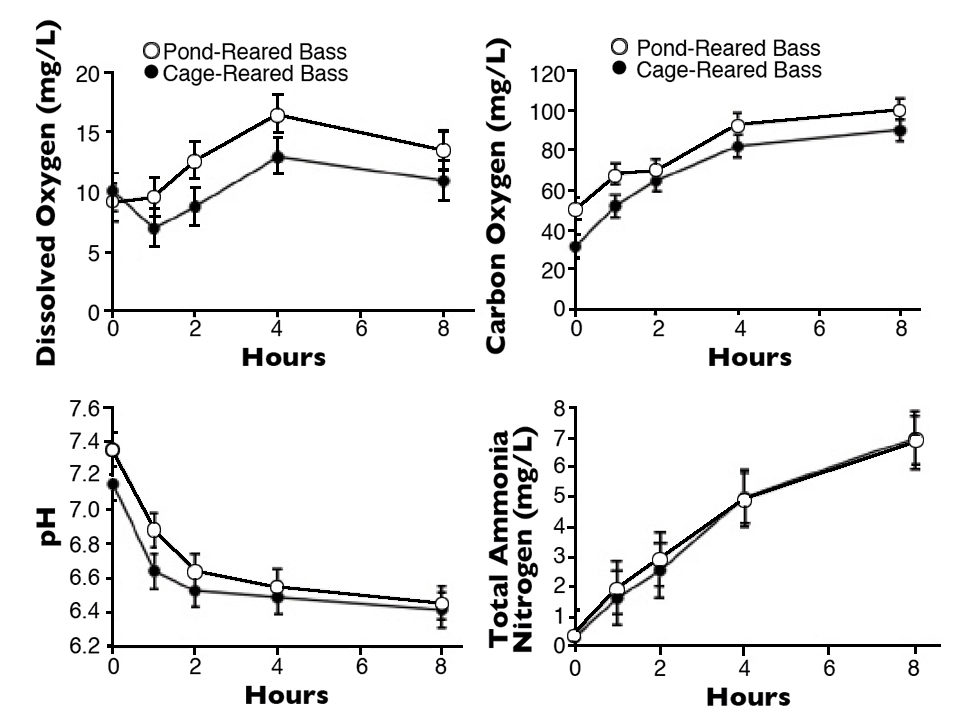 In one experiment, market-size fish with individual weights of 650 ± 13 g were harvested by seining from earthen ponds and dip netting from floating cages, then stocked at a rate equivalent to 97 g fish/L in a two-compartment, insulated aluminum live hauler and held for eight hours to simulate transport. About 60 pond-raised and 65 cage-raised bass were stocked. The procedure was repeated on four replicate days.