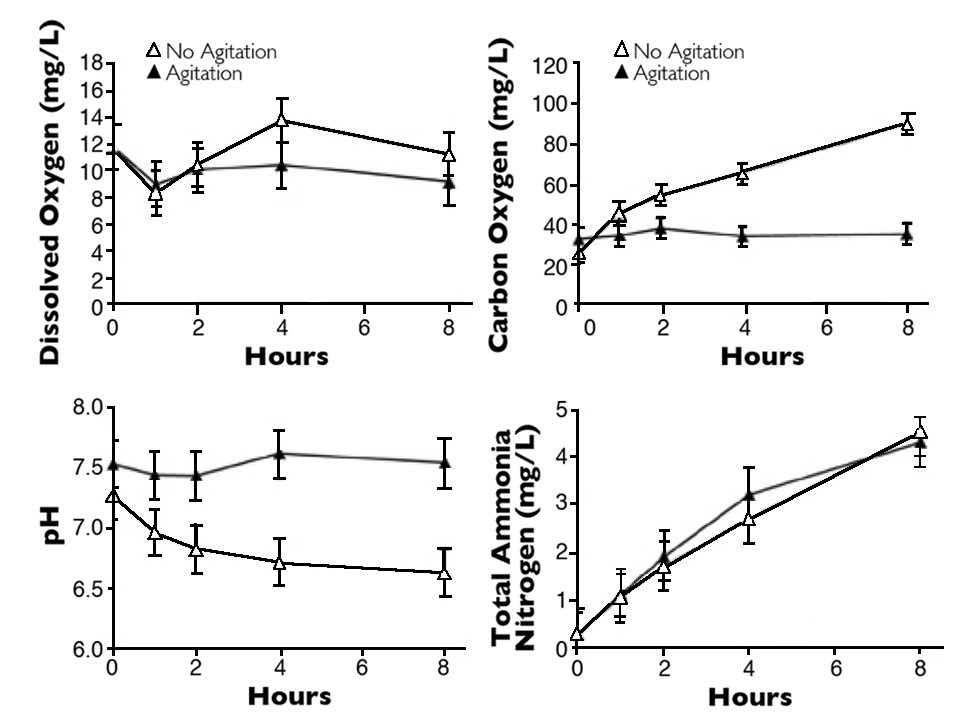 Although agitation mitigated the carbon dioxide accumulation and stabilized pH, the total ammonia nitrogen equilibrium shifted in favor of un-ionized ammonia nitrogen (Fig. 2). Minor differences in blood chemistry were noted, but the use of agitators did not substantially attenuate the stress response observed.