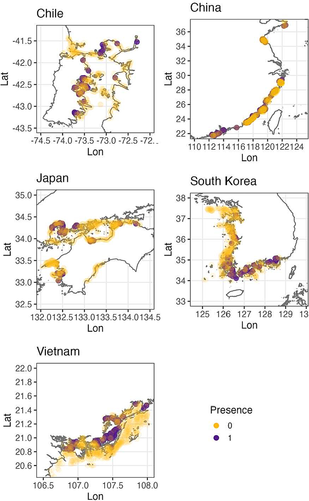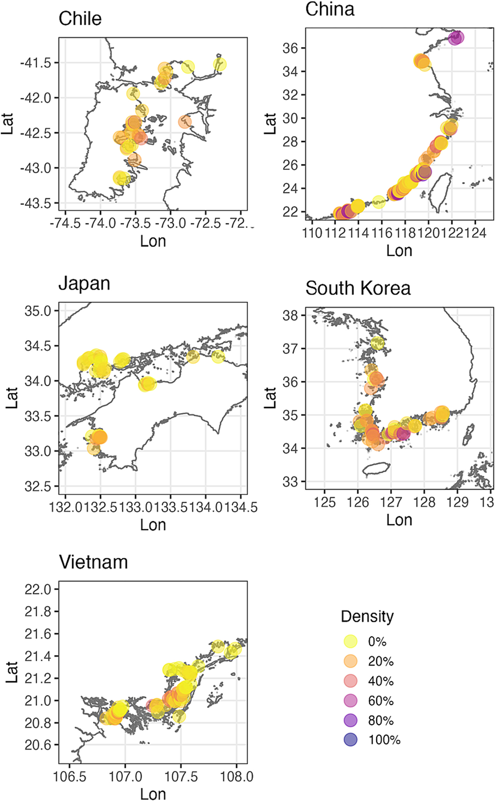 El mapeo espacial de las estructuras superficiales en las principales áreas de producción reveló información sobre las características del cultivo de mariscos y algas. Entre los cinco principales países productores, la producción fue más densa en Corea del Sur y China, con China claramente dominando en abundancia de estructura. Las estructuras de palangre eran mucho más comunes que las balsas en todos los países excepto en Japón. Las granjas estaban más alejadas de la costa en China y más cercanas a la costa en Vietnam.