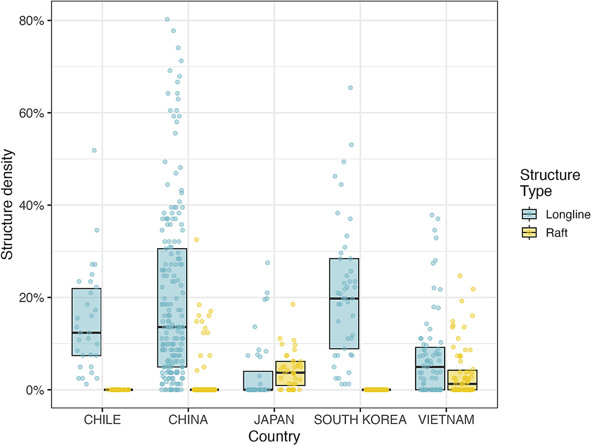 Los países con mayor densidad de estructuras tenían mayor cantidad de estructuras de palangre que de balsas. Las variaciones en el tipo de estructura entre países pueden reflejar diferentes técnicas y tradiciones de cultivo. La producción en Japón tiene un mayor porcentaje de estructuras en forma de balsas, al igual que Vietnam. Esto podría estar directamente relacionado con las especies que se cultivan, lo que refleja la demanda de la industria y la idoneidad ambiental, o ser el resultado de diferencias regionales en la oferta y el desarrollo tecnológico. La producción en balsas es una estrategia agrícola común empleada para cultivar ostras, vieiras, almejas y muchas algas, todas las cuales se producen en grandes cantidades en Japón y Vietnam.