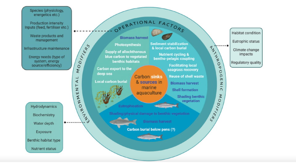 Durante tres años, el equipo examinó las principales fuentes de emisiones de GEI y evaluó tanto las oportunidades de reducción de emisiones como el potencial de secuestro de carbono de tres sectores clave de la acuacultura marina: algas, bivalvos y peces alimentados. Examinaron las huellas de carbono de los sectores y exploraron la influencia de las prácticas agrícolas en la dinámica del carbono marino local (ver Fig. 1).