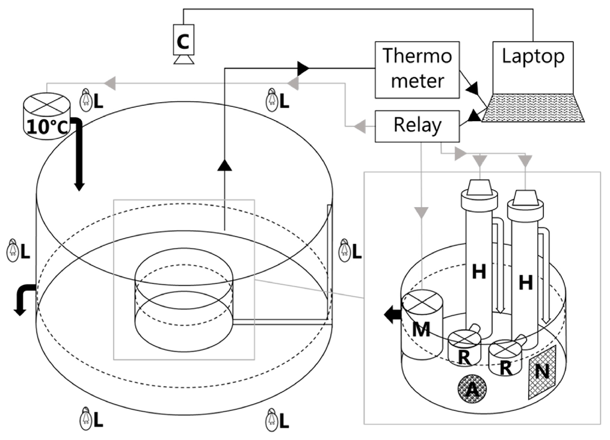 Prior to subjecting the fish to the incremental temperature increase, an acclimation period of two hours was implemented. The temperature was increased by 2 degrees-C (at a rate of 3.4 degrees-C per hour). At each pre-set temperature point, the heating unit underwent a 15-minute deactivation period at which the behavior of the fish was observed. During this interval, a video camera positioned vertically above the tank recorded the fish in the tank. The camera was connected to a PC via a frame grabber and recorded at 25 frames per second, ensuring comprehensive documentation of the fish’s behavioral responses to the incremental temperature increase.