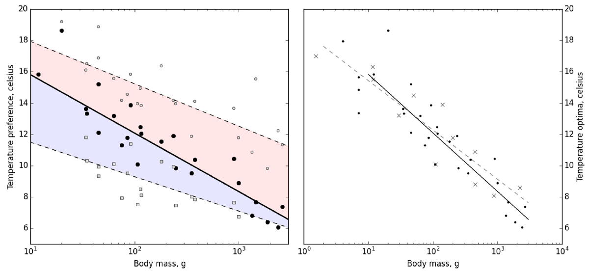 This correlation suggests that larger fish, by exhibiting a behavioral preference for colder areas, may undergo shifts in distribution toward polar regions or deeper waters in response to localized global warming. In essence, our findings contribute valuable insights that enhance predictions of species distribution shifts, highlighting the pivotal role of behavioral size-dependent temperature preference in shaping fish populations and offering essential considerations for conservation efforts.
