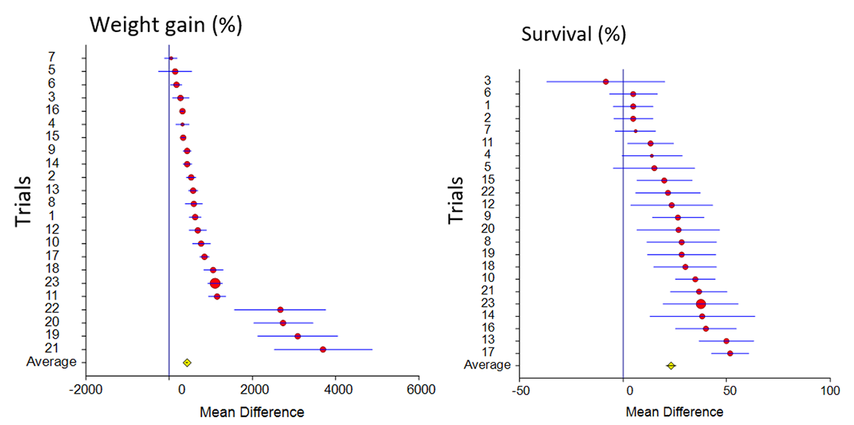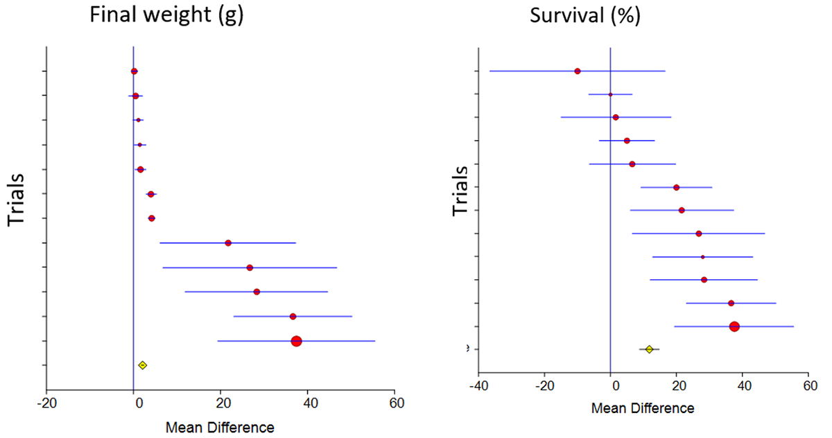 The results of trials conducted in both small and pilot-scale tanks completed in the last years were compiled to evaluate the efficacy of feeding the additive compared to a control for L. vannamei. All data were submitted to statistical meta-analyses of means using SPSS, an approach that has been underutilized by the aquaculture industry to validate products.