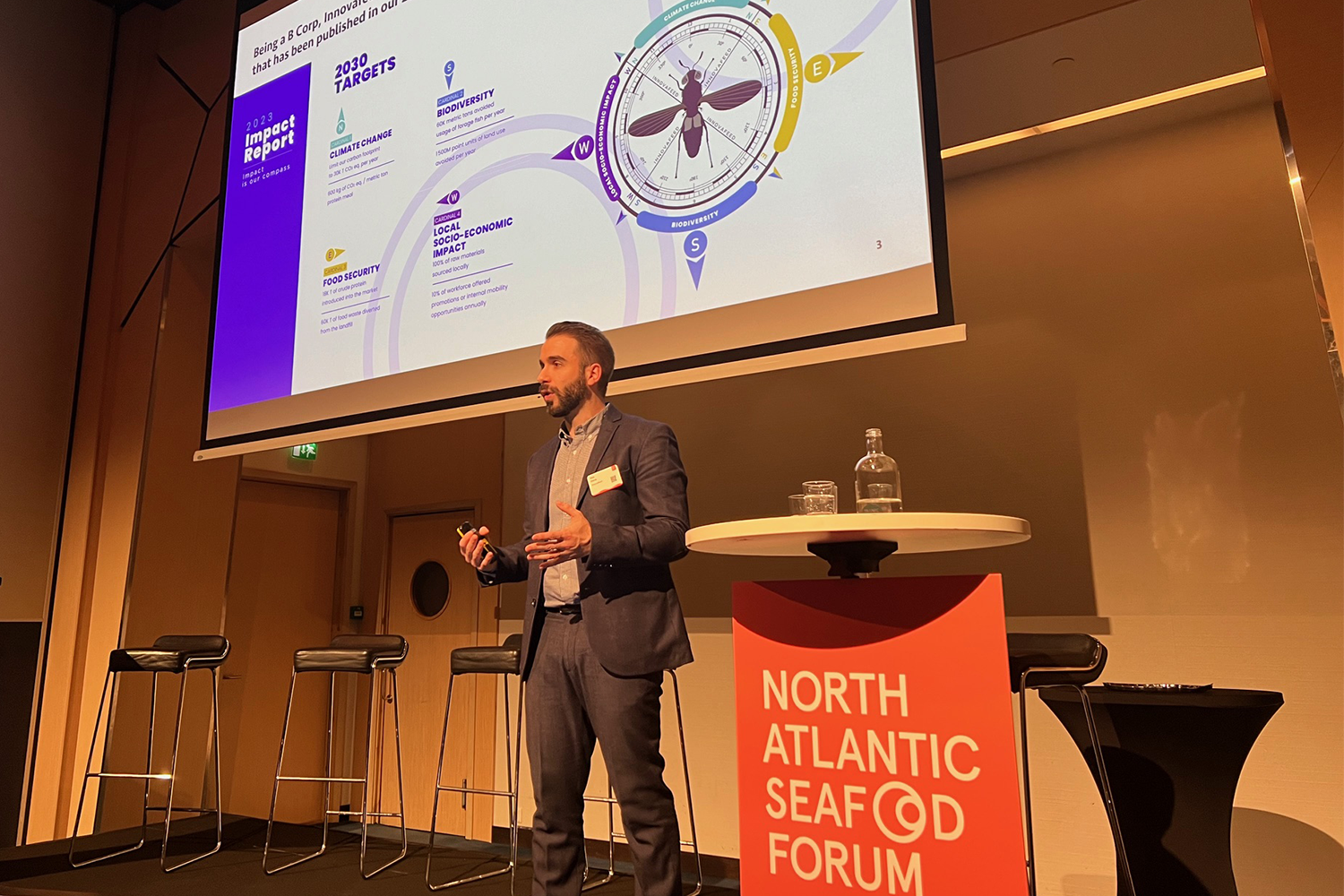 France-based biotech company Innovafeed unveiled its first Impact Report at the event to showcase the potential of black soldier fly larvae meal. Alex Diana, product manager at the company, said its “industrial symbiosis” production model emits 80 percent less carbon dioxide than an equivalent factory, which removes 12,000 truck journeys a year. Its new product range Hilucia includes an oil that is a “high quality source of fatty acids and energy for fish.” Innovafeed has identified more than 170 sites worldwide for potential development of insect meal factories.