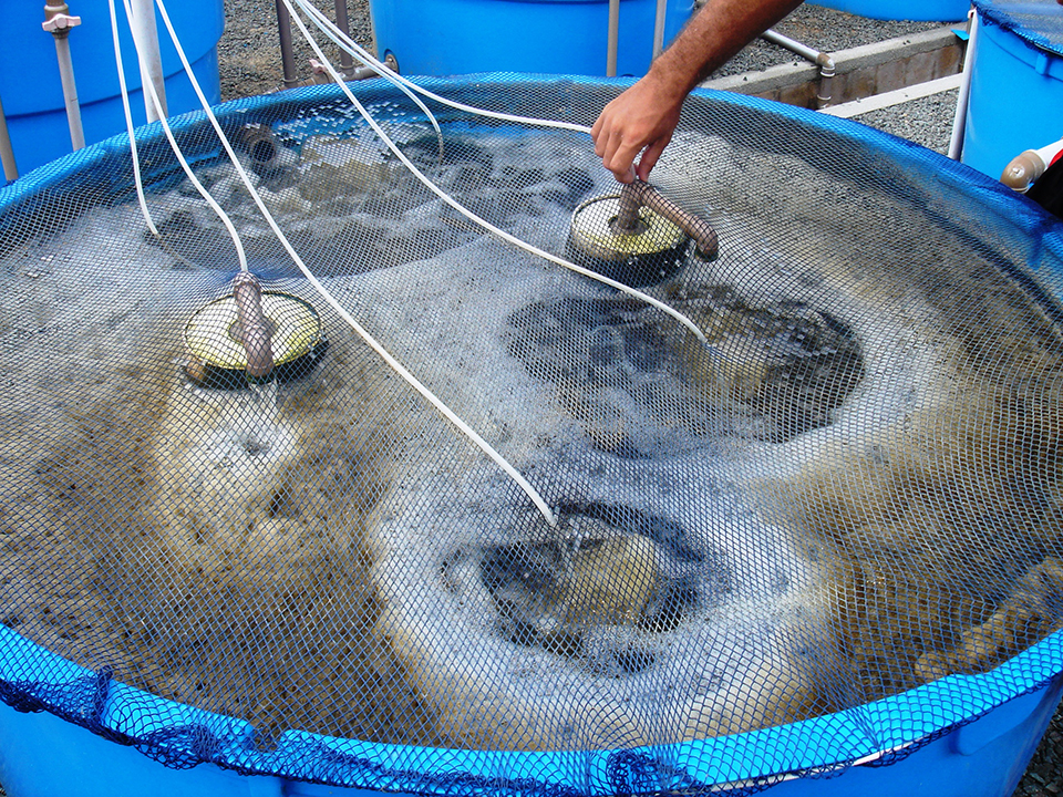 Suspended particulates and phytoplankton can be cleared from the water by bivalves and other filter feeders in raceway side-stream settling basins to upcycle nutrients into yieldable biomass. Where large surface areas are available, seaweed biofiltration should be considered for upcycling nutrients. In integrated cultures with bivalves, complimentary biofiltration of seaweed can improve bioremediation efficiency and alleviate pressure from coastal eutrophication risk. In multitrophic systems, bivalve biodeposits can additionally be used as food for deposit feeders beneath cages, such as holothuroids, polychaetes and echinoids. These could bioturbate and oxygenate the sediments, and regenerate dissolved inorganic nitrogen, making it available for other extractive species, while potentially yielding 5 to 15 kg per square meter per production cycle in IMTAs. Deposit feeders, together with so-called extractive species, such as bivalves and seaweed, could be directly harvested for human consumption or used to feed other cultured species.