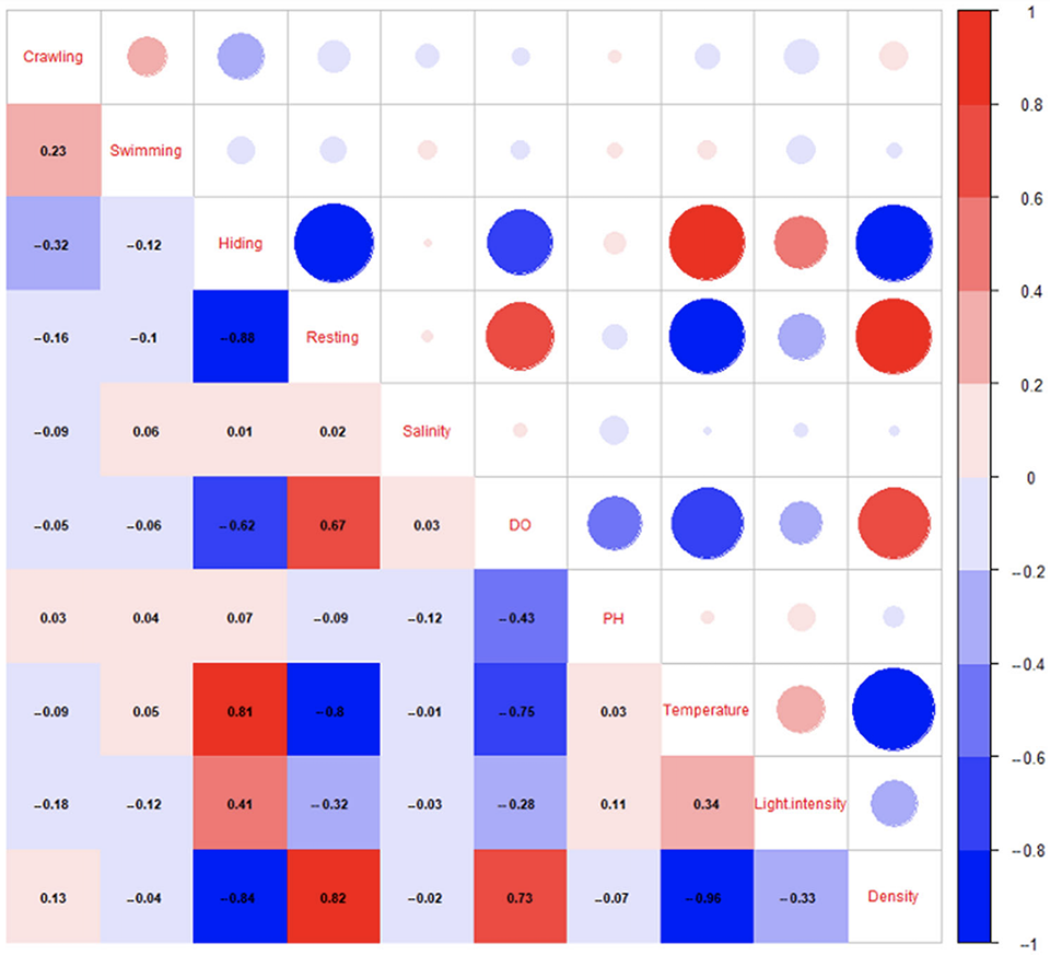 Adequate water quality is essential for the proper functioning of animals and for shrimp aquaculture to run normally. Our research is the first to explore the combined effects of temperature, pH, dissolved oxygen and salinity on P. japonicus behavior rather than a single water-quality factor. In terms of shrimp resting and concealing behavior in farms, temperature and DO exert a substantial impact, in which a negative link was found between temperature and the percentage of shrimp resting on the sand and a positive link was found between temperature and the percentage of shrimp hiding in the sand, and dissolved oxygen exhibited the reverse pattern. Temperatures that are too high and low dissolved oxygen levels are an uncomfortable environment where P. japonicus is cultured, so the animals may choose to stay in the sand rather than on the sand’s surface or in the water.