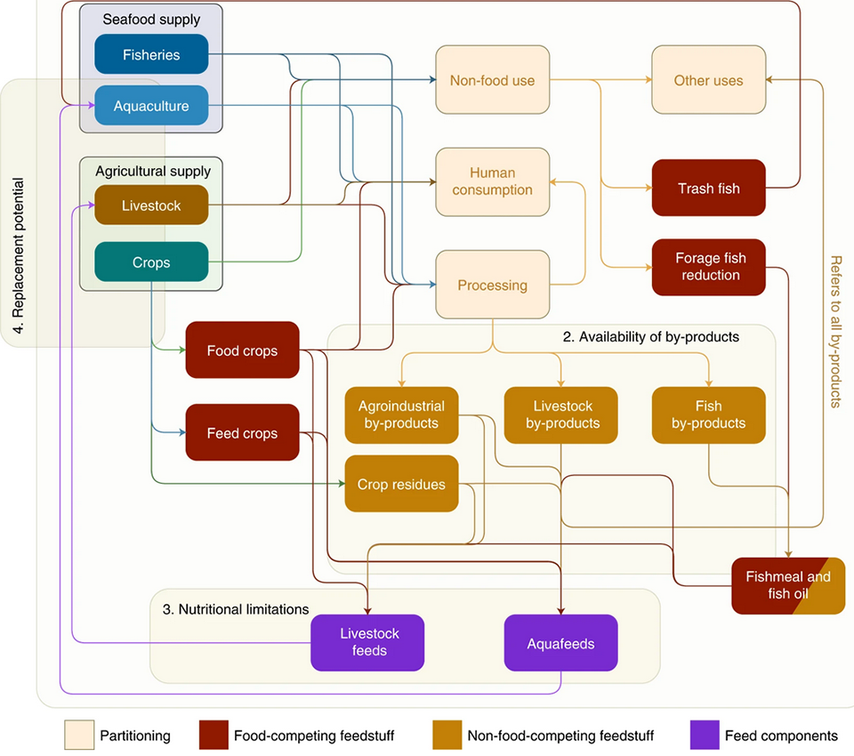 La estructura actual del sistema alimentario mundial da como resultado una disponibilidad de alimentos subóptima, ya que los seres humanos podrían consumir una gran proporción de los recursos utilizados en la alimentación del ganado y la acuacultura. Hasta el 40 por ciento de toda la tierra cultivable y más del 30 por ciento de la producción de cultivos de cereales se utiliza para alimentos animales y aproximadamente el 23 por ciento de todo el pescado capturado se destina a usos no alimentarios, principalmente para la alimentación de peces y ganado. Esta competencia entre alimentos y piensos reduce la eficiencia del sistema alimentario existente, ya que los costos ambientales y de recursos son más altos cuando la tierra cultivable se utiliza para la producción de alimentos para animales en lugar de contribuir directamente al consumo humano.
