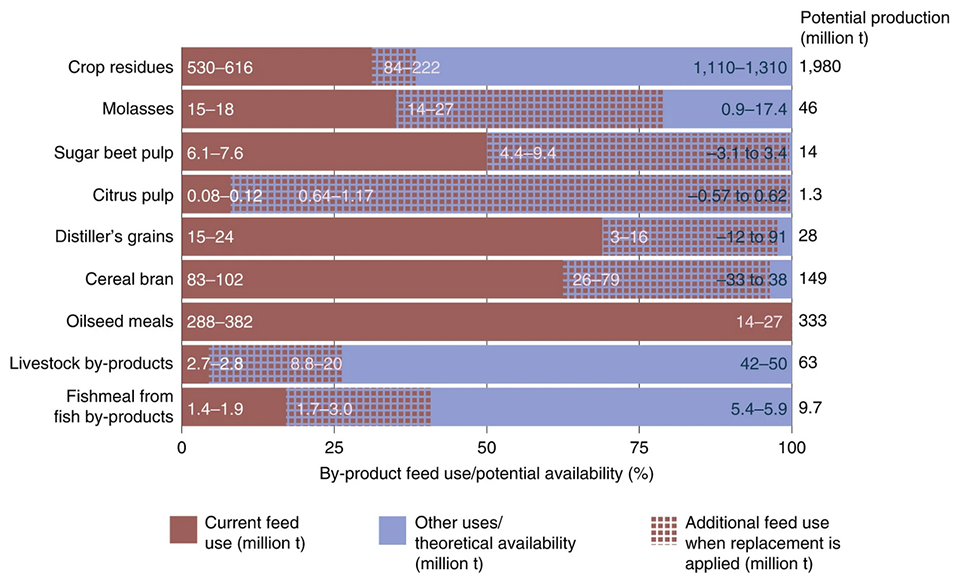 Los aspectos nutricionales también pueden limitar el potencial. Algunos subproductos son de menor calidad nutricional y pueden contener compuestos antinutritivos o altas cantidades de fibra que pueden conducir a una disminución de la producción animal, especialmente en animales monogástricos. Este es particularmente el caso de los residuos de cultivos, que muestran el mayor potencial de disponibilidad (Fig. 5).