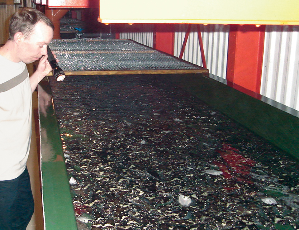 In the deep raceway, all feed pellets pass through the upper ninth shelf level, which receives 10 times the amount of feed the fish need. The pellets not eaten in the upper level sink and pass to the next shelf level, and so on. The lowest shelf level receives twice what it needs, while the fish on the bottom receive exactly the needed amount. Pellet counters under the lowest shelf level facilitate close control of the feeding.