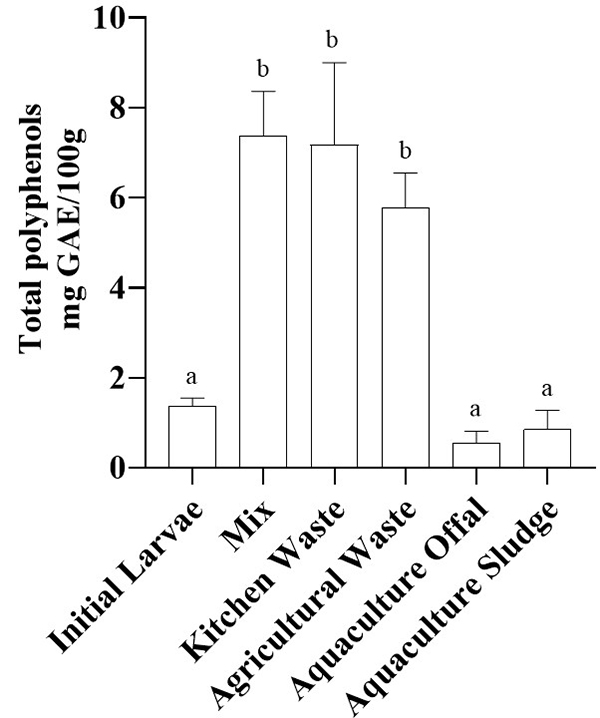 Considering that KW and AW were 100 percent plant-based while MX was 50 percent animal and 50 percent plant-based, and that MX had the highest yet not statistically different TPC to KW and AW, it is possible that BSFL have an upper limit of polyphenol saturation of 5.8–7.4 mg GAE/ 100g. This result suggests a potential upper threshold for polyphenol accumulation in BSFL, similar to nutrient saturation observed for protein and lipids.