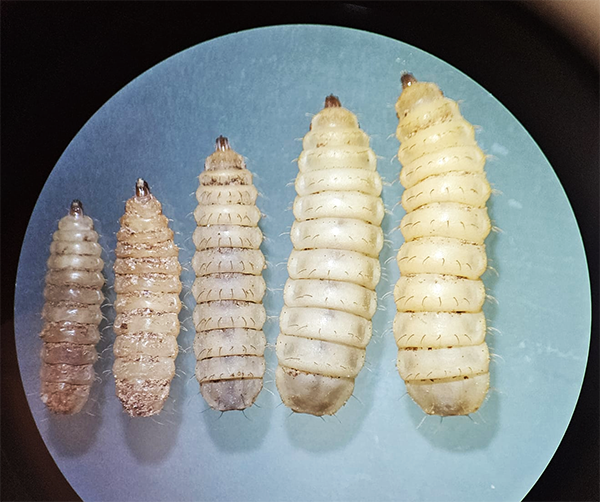 Five-day-old larvae were placed into experimental containers with their respective diets. Each container, sealed with a tight-fitting lid and equipped with small holes covered with a screen for airflow and escapee prevention, served as a replicate. There were five dietary treatments, each with four replicates, and every replicate contained 200 larvae, 60 g of Hydrated Coconut Coir (HCC), and a feed amount equivalent to 500 percent of the larval biomass in the container.