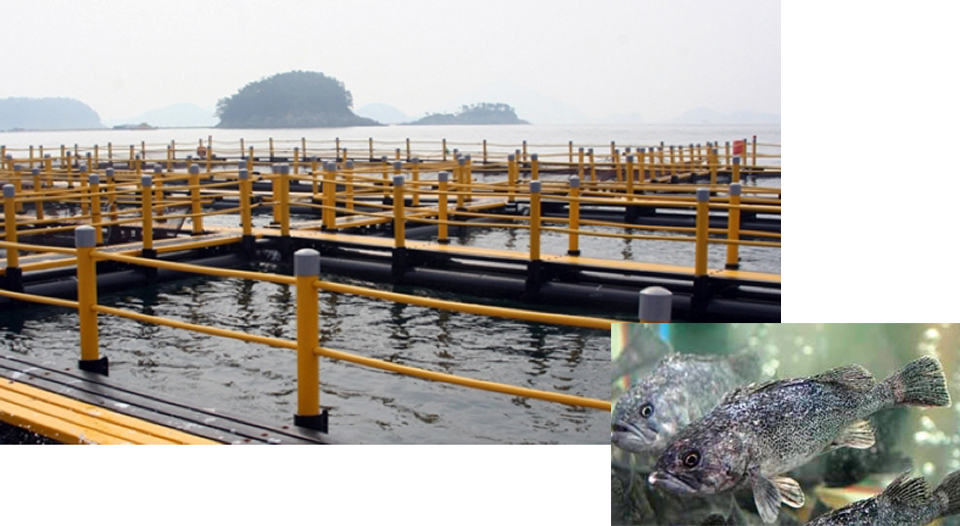 Hatcheries produce Korean rockfish seedlings in indoor tanks for sorting and grading. The fish grow well at relatively low water temperatures in net cages.