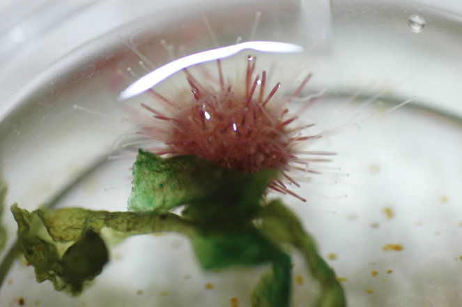 Following the completion of metamorphosis, the urchin begins to feed. The young urchin’s nutritional requirements were found to be quite complex, requiring more than a year for Hinegardner to find an appropriate algal food that could be cultured in the laboratory.