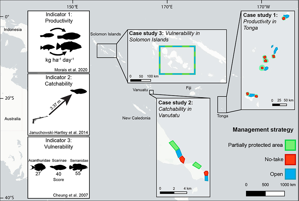 Three case studies of partially protected coral reef fishery systems were examined to evaluate the benefits and risks of their use as a management tool. Data used came from community-based management arrangements in three Pacific Island countries to demonstrate three vignettes of how partial protection can boost fisheries production, enhance the ease with which fishers catch their prey, and alter the composition of fisheries yields. Topics studied were (1) potential fisheries productivity in Tonga; (2) individual fish catchability in Vanuatu; and (3) intrinsic vulnerability to catch in the Solomon Islands (Fig. 1).