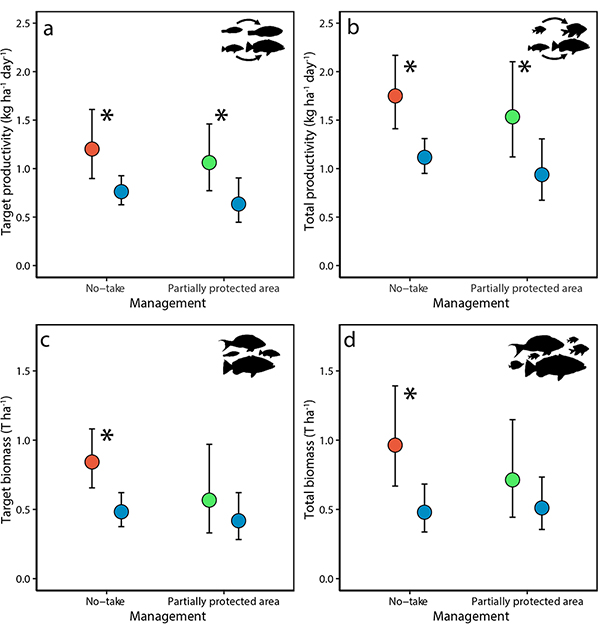 The surveys in Tonga reveal that both the no-take reserves and PPAs have significantly higher potential fisheries productivity compared with control areas (Fig. 2 a, b). Target reef fish productivity was approximately 60 percent greater inside PPAs (1.06 kg/ha/day) where fishing is still allowed by community members, and in no-take reserves (1.20 kg/ha/day), compared with statistically matched control sites open to fishing (0.64 kg/ha/day, and 0.76 kg/ha/day, respectively). In contrast, significant differences in standing biomass of target species were only observed for no-take reserves, when compared with openly fished areas and PPAs (Fig. 2 c, d).