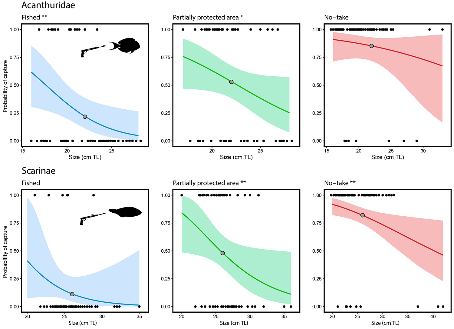 The surveys revealed size dependency in the catchability of fish of the family Acanthuridae and subfamily Scarinae between management strategies (Fig. 3). As fishing restrictions increased (from openly fished reefs to PPA to no-take reserves), so too did the probability of approaching to within spearing range of individuals.