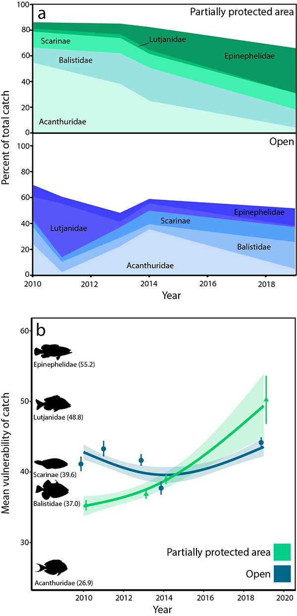 Additional analysis demonstrated that these changes were also consistent for absolute numbers of individuals caught, with the mean number of acanthurids caught per trip in PPAs declining from 8.5 to 0.26, whereas epinephelids caught in PPAs increased from an average of 0.77 to 2.42 per trip. These changes were not evident on reefs that were continuously open to fishing year-round. Changes in catch composition through time also altered the overall life-history characteristics of the catch.
