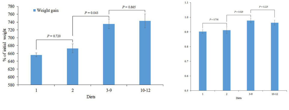 Interestingly, contrast analyses on weight gain (Fig. 1) and feed efficiency (Fig. 2) showed that LMB fed diets 3-9 outperformed those fed diet 2 (P<0.05), corroborating previous data that LMB have limited ability to synthesize EPA and DHA from LNA (Subhadra et al 2006). In addition, the lack of significant differences between dietary treatments 1 and 2 for all performance parameters evaluated (Table 2; Figs. 1 and 2) suggest that LMB has a low dietary LNA requirement.