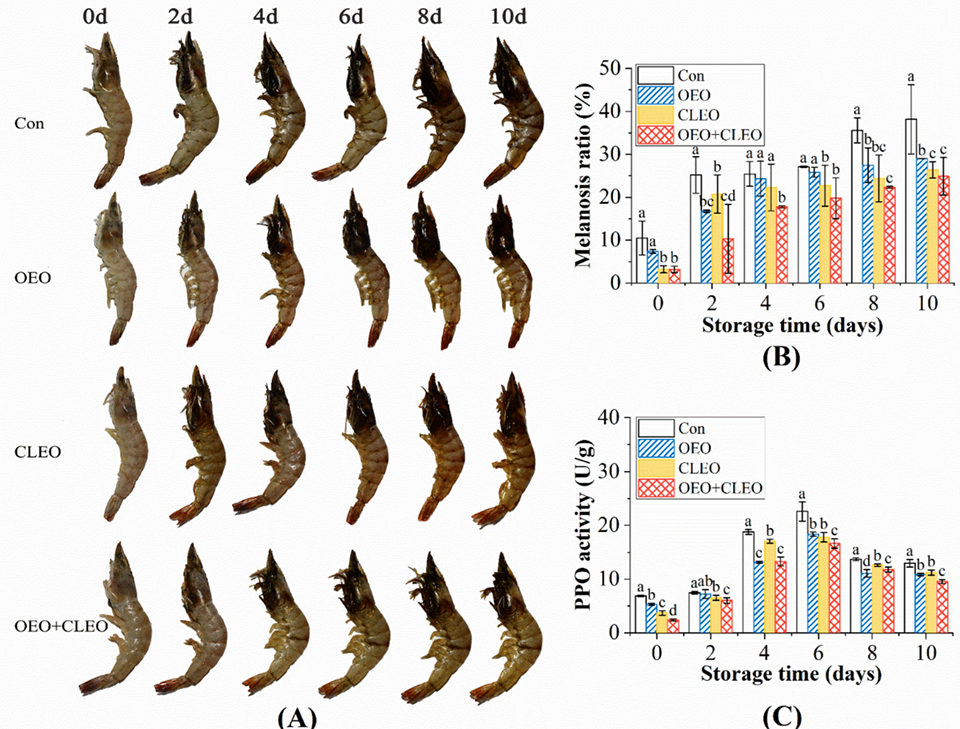 Para la proporción de melanosis, la Fig. 3 muestra fotos de camarones blancos del Pacífico durante el almacenamiento. La melanosis generalmente comienza en el cefalotórax y luego se extiende al abdomen y la cola. La proporción de melanosis del control fue significativamente mayor que la de las muestras tratadas durante todo el período de almacenamiento, lo que indica que se produjeron más manchas negras en todo el camarón. La proporción de melanosis se correlacionó negativamente con los cambios en los valores de blancura. CLEO parecía tener un efecto inhibidor más fuerte sobre la melanosis que OEO, ya que los camarones tratados con OEO tenían una mayor proporción de melanosis. El tratamiento combinado de OEO y CLEO mostró la relación de melanosis más baja, lo que indica que los dos aceites esenciales tuvieron un efecto sinérgico en la inhibición de la propagación de las manchas negras.