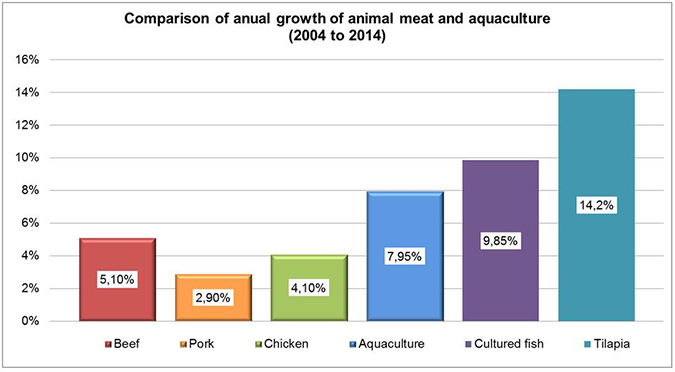 La acuacultura ha experimentado su mayor crecimiento en la última década (con un promedio de 8 por ciento por año) en comparación con otras industrias animales (Figura 1), pero todavía está muy por detrás de la producción alcanzada por las industrias avícola, bovina y porcina. Brasil tiene un mercado interno fuerte, cosechas abundantes de granos, una industria de alimentos animales bien establecida, clima tropical durante todo el año en la mayor parte del país, abundante agua dulce, amplias zonas aptas para estanques, una línea costera de 8.500 km para la acuicultura marina, 4,2 millones de ha de embalses internos, tecnología de producción capaz, varias universidades y centros de investigación dedicados a la acuicultura, y condiciones que pueden ayudar a impulsar la acuacultura sostenible, junto con una mejor organización y unas políticas gubernamentales más eficaces para el sector.