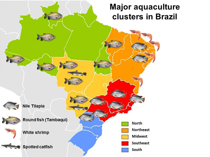 La principal especie acuícola en Brasil, con 260.000 TM producidas en 2014, 31 por ciento más que en 2011, según los datos de ACQUA IMAGEM. La producción de tilapia creció a un promedio del 14,2 por ciento al año en la última década. Los grupos principales de tilapia se encuentran en el Estado de Paraná Occidental (cultivo en estanques) y en los embalses del nordeste y sudeste de Brasil (cultivo en jaulas). En el noreste de Brasil, los principales grupos de tilapia se encuentran a lo largo del curso del Río San Francisco (Lagos Sobradinho, Itaparica, Moxotó y Xingó) y el Río Jaguaribe (Lagos Castanhão y Orós).