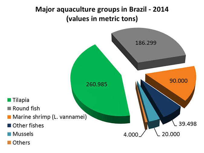 Por conveniencia política, las estadísticas oficiales sobre la acuacultura brasileña han sido engañosas durante los últimos años. En 2010 ACQUA IMAGEM inició una recolección sistemática de datos sobre la producción, los precios, las compañías acuícolas y de alimentos acuícolas, y otros datos relativos a los grandes conglomerados de la acuacultura en Brasil (Figura 2). Los datos de las encuestas ACQUA IMAGEM para 2011 y 2014 se publicaron en Panorama da Aquicultura, una revista de la acuicultura brasileña. Acqua Imagem estima que 486.000 toneladas de peces fueron cultivadas en Brasil en 2014. La Asociación Brasileña de Criadores de Camarón (ABCC) registró que 90.000 toneladas de camarón marino se cultivaron en el mismo año.