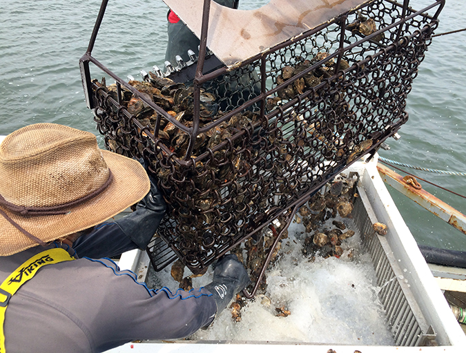 “We used to shuttle oysters off the deck two to three times a day, but it wasn’t enough,” says Bloom. He says they’ve had to change harvest methods and have invested nearly $500,000 on new equipment including a heavier crane, stainless steel cages, an ice machine, refrigeration and more.