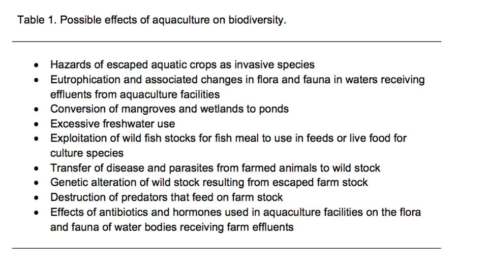 The best simple compilation of the possible effects of aquaculture on biodiversity that I have seen was made by Dr. James Diana of the University of Michigan. A slightly modified version of his list is provided (Table 1). Emissions to the atmosphere of carbon dioxide and other greenhouse gases associated with climate change, and sulfur dioxide and other substances with the potential to cause acidification result from aquaculture.
