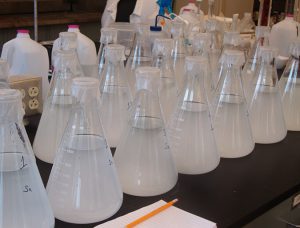Se recolectaron muestras de agua de 100 mL de matraces antes de aplicaciones de piedra caliza agrícola, 24 horas después de la aplicación, y semanalmente durante nueve semanas. Los matraces se colocaron en un banco de laboratorio a 23 a 25 grados C con bocas abiertas a la atmósfera. Al final de cada semana de trabajo, los recipientes de plástico se taparon y sus contenidos se agitaron manualmente durante 10 segundos.