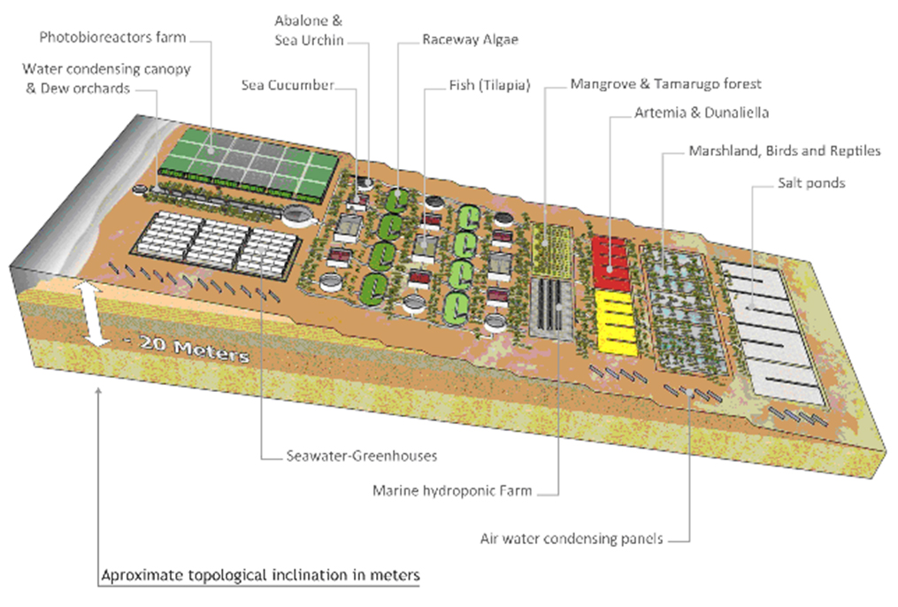 The project proposes to produce simultaneously and sustainably various fishes, crustaceans, molluscs, macroalgae, additional aquatic crops, aquaponics crops, biogas and hydroelectric power. The saline effluent will drain to reservoirs, which will produce “green water” microalgae like Dunaliella sp. that will feed brine shrimp, planktivorous fish, molluscs and birds. The final brine will evaporate at the shebqhas’ bottoms, sequestering salt from the sea (~ 105 tons/km2/year) and humidifying the desert air.