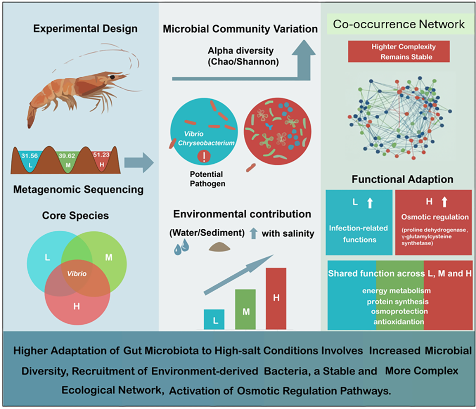 Taken together, the authors’ results provide the first simultaneous demonstration – through both structural and functional perspectives – of the potential pathogenic features dominating the intestinal microbiota under low-salinity conditions and the adaptive strategies employed by the microbiota in hypersaline (H) environments. Their insights offer valuable guidance for improving health management and disease prevention strategies in high-salinity shrimp aquaculture systems.