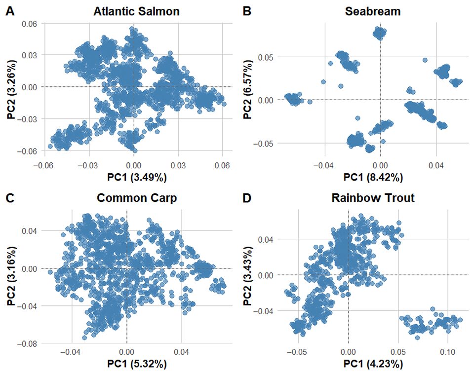 This study offers a standardized, cross-species comparison of genomic prediction performance in four key aquaculture species, evaluating GBLUP, various Bayesian methods and machine learning models. Prediction accuracy showed considerable variation across species and traits, driven primarily by trait heritability, population genetic structure and the specific model employed. No single model emerged as the best performer in every situation.