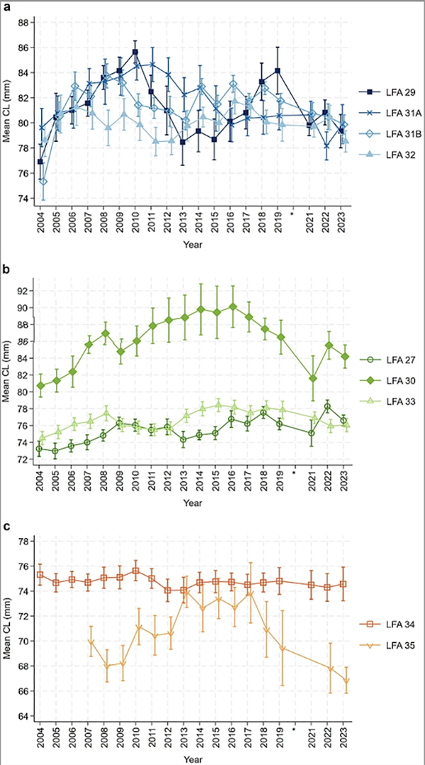 - Mid-depth LFAs (~8 meters: 27, 30, 33) exhibited increasing mean CL (fewer small individuals) alongside declining juvenile proportions, with pronounced drops in areas like Northeastern Cape Breton (LFAs 27, 30) and the South Shore (LFA 33).