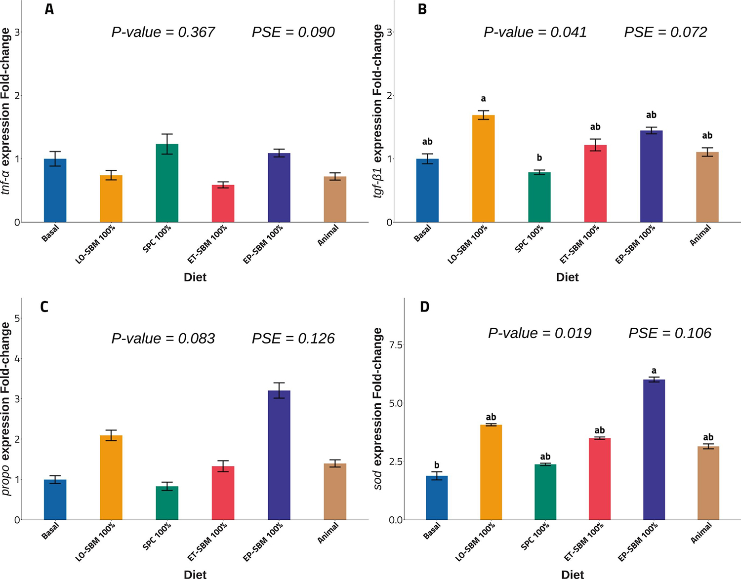 Histological examination of the intestine revealed no enteritis-like morphological alterations in any group. In the green-water trial, no notable changes in health-related gene expression occurred in the gut. In the biofloc system trial, however, shrimp receiving SPC or SE-SBM diets exhibited general downregulation of the monitored target genes relative to those fed LO-SBM or EP-SBM.