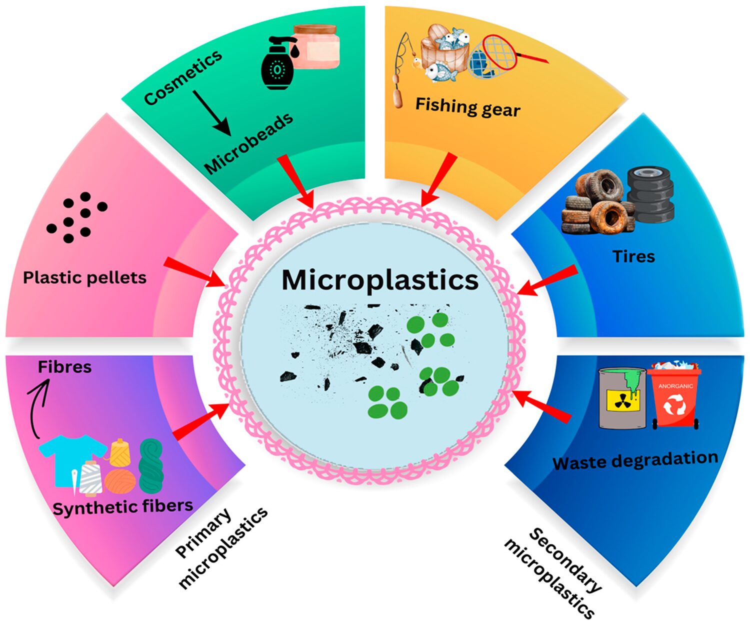 Sources are classified as primary (manufactured particles from cosmetics, textiles, detergents, paints, agriculture, and industrial pellets) and secondary (degraded from larger plastics via UV, abrasion and biological processes, mainly from packaging, construction and automotive waste).