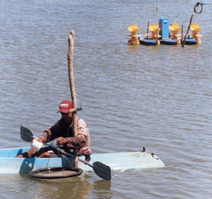 Aerated microbial reuse systems utilize intense aeration and mixing to produce yields of 10 to 30 metric tons per hectare per cycle with little or no water exchange.