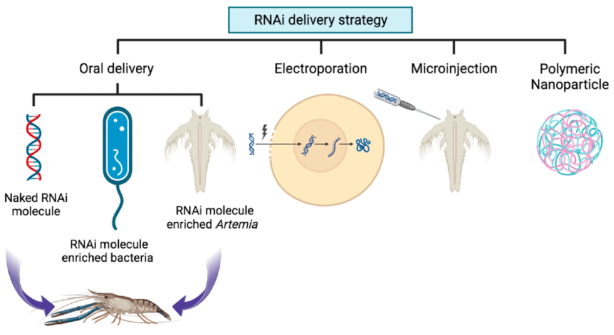 La administración más efectiva de moléculas de ARNi se ha logrado mediante la ingesta oral de bacterias enriquecidas con dsRNA y cigotos viables de artemia (óvulo fecundado procedente de la unión de un óvulo femenino con un espermatozoide masculino), y destaca la vía oral. como el enfoque más alentador para entregar ARNi en ambientes acuáticos.